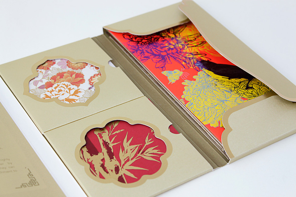 Red packet set of 12 using Gmund’s creative paper collection, demonstrating different application of print effects. Gmund is an paper mill located in Germany, specialising in the development of innovative papers and card stock.